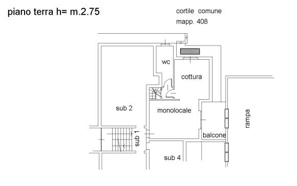 Appartamento di mq. 86 piano terreno, ingresso-soggiorno, cucina e bagno; una scala interna collega ad un piano seminterrato adibito a zona notte con due camere da letto e bagno-lavanderia.