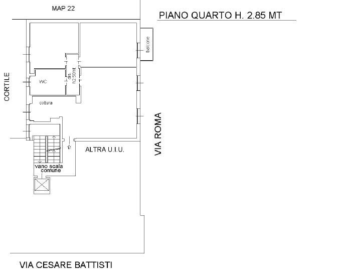 Ampio trilocale con doppio affaccio, ubicato al piano quarto (con ascensore) composto da: soggiorno con cucina a vista, disimpegno notte, due camere di cui una con balcone, bagno, ripostiglio in sottotetto.